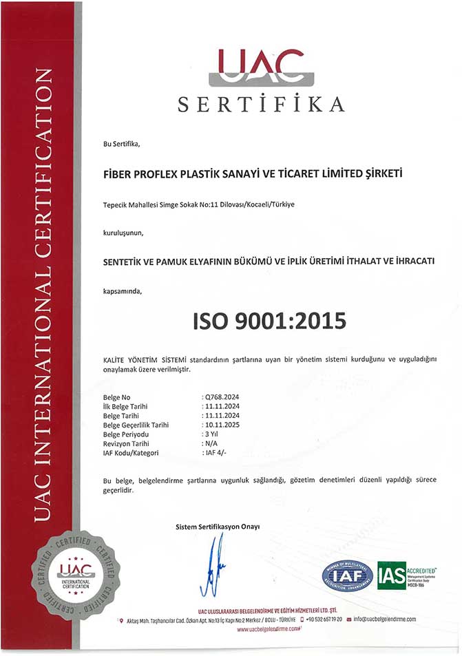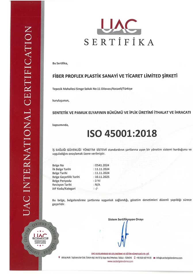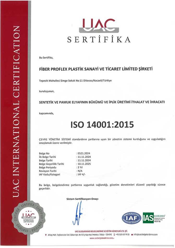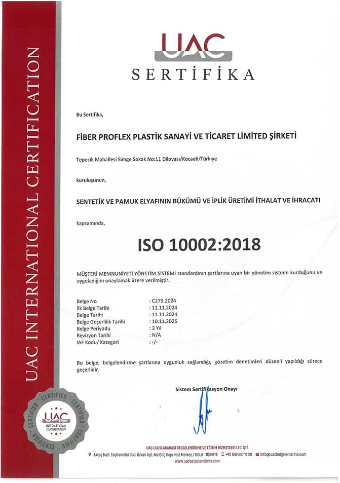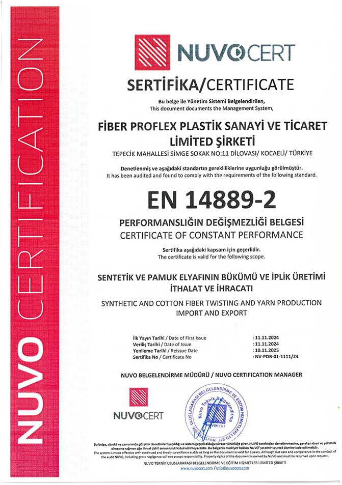 Belgeler | CE, EN 14889-2, ISO 9001:2015, ISO 14001:2015, ISO 45001:2018, ISO 10002:2018 |